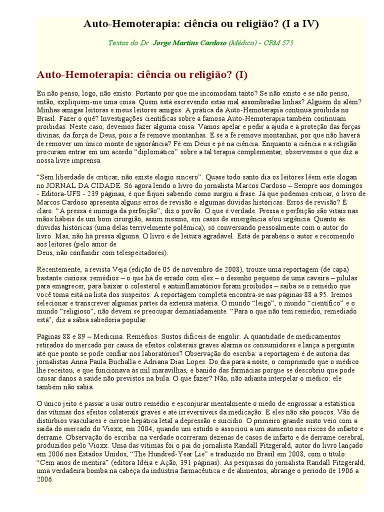 Eu não penso, logo, não existo. Portanto por que me incomodam tanto? Se não existo e se não penso, então, expliquem-me uma coisa. Quem está escrevendo estas mal assombradas linhas? Alguém do além? Minhas amigas leitoras e meus leitores amigos. A prática da Auto-Hemoterapia continua proibida no Brasil. Fazer o quê? Investigações científicas sobre a famosa Auto-Hemoterapia também continuam proibidas. Neste caso, devemos fazer alguma coisa. Vamos apelar e pedir a ajuda e a proteção das forças divinas, da força de Deus, pois a fé remove montanhas. E se a fé remove montanhas, por que não haverá de remover um único monte de ignorância? Fé em Deus e pé na ciência. Enquanto a ciência e a religião procuram entrar em um acordo “diplomático” sobre a tal terapia complementar, observemos o que diz a nossa livre imprensa.