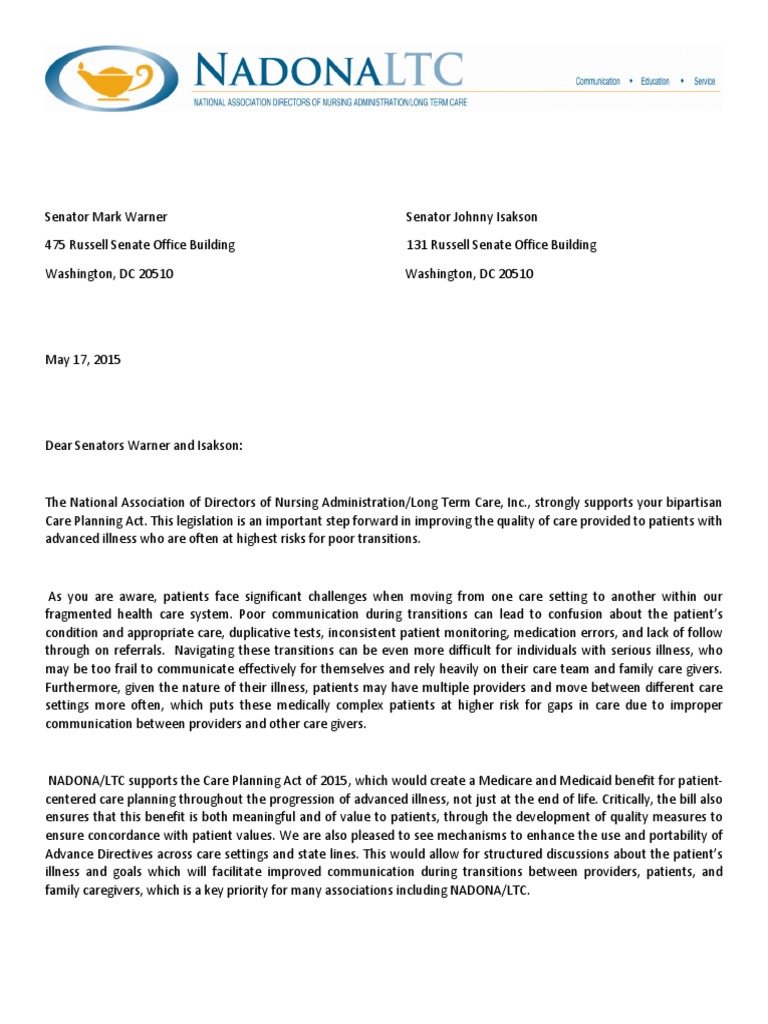 condition and appropriate care, duplicative tests, inconsistent patient monitoring, medication errors, and lack of follow through on referrals. Navigating these transitions can be even more difficult for individuals with serious illness, who may be too frail to communicate effectively for themselves and rely heavily on their care team and family care givers. Furthermore, given the nature of their illness, patients may have multiple providers and move between different care settings more often, which puts these medically complex patients at higher risk for gaps in care due to improper communication between providers and other care givers. NADONA/LTC supports the Care Planning Act of 2015, which would create a Medicare and Medicaid benefit for patient-centered care planning throughout the progression of advanced illness, not just at the end of life. Critically, the bill also ensures that this benefit is both meaningful and of value to patients, through the development of quality measures to ensure concordance with patient values. We are also pleased to see mechanisms to enhance the use and portability of