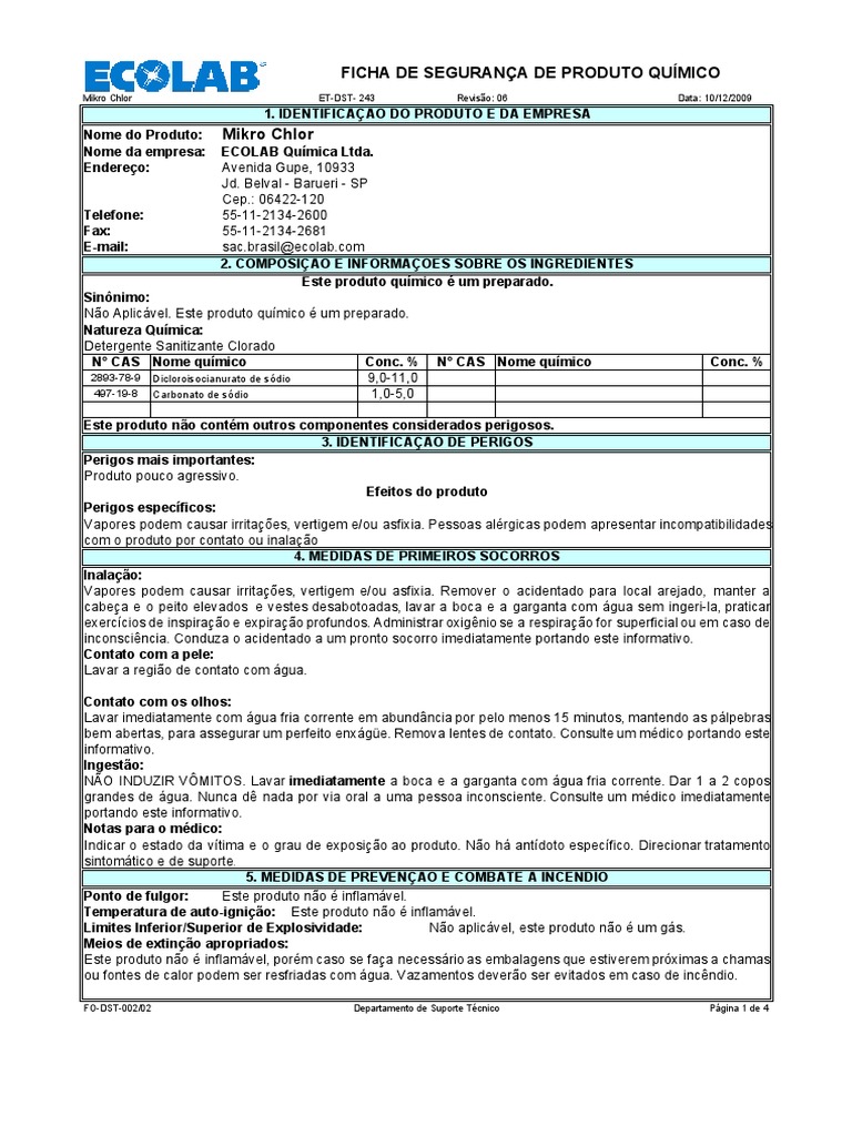 FICHA DE SEGURANÇA DE PRODUTO QUÍMICO