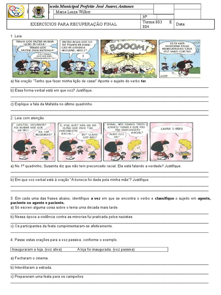 3. Em cada uma das frases abaixo, identifique a voz em que se encontra o verbo e classifique o sujeito em agente,