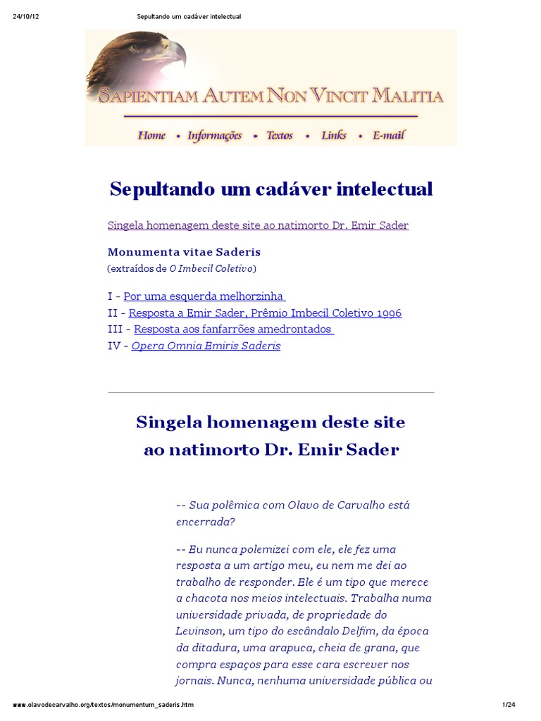 desativado, parece ). Pretender nos impingir Emir Sader e Muniz Sodré como intelectuais de esquerda é simplesmente um caso para a Delegacia do Consumidor. Imagino se Ênio, ou José Honório, criticados justa ou injustamente, iriam se fazer de donzelas ofendidas e responder com chavões idiotas, em vez de analisar com meticulosa honestidade as afirmações do crítico, para impugná-las, se cabível, no campo da lógica e da argumentação culturalmente relevante, exatamente como fiz com as opiniões de Pires e de Sader. Imagino se Caio, ou Otto, em vez de se defender sozinhos como os bravos homens que eram, iriam correr como pintainhos assustados para se abrigar sob as asas da solidariedade corporativa, como hoje o fazem esses pobres coitados. Não, não censuro um Sader, um Muniz Sodré, por serem intelectuais de esquerda, mas justamente por não o serem; por serem apenas as tristes caricaturas de uma família cultural que já teve entre seus membros algumas das mais altas expressões da inteligência pátria.