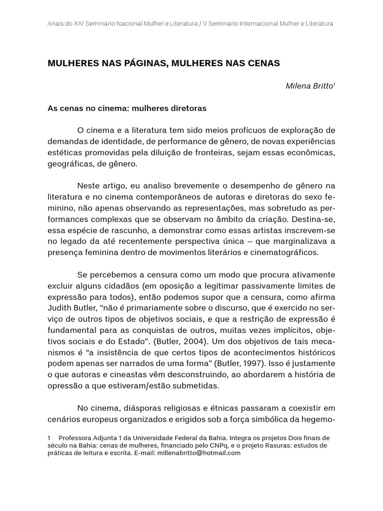 Neste artigo, eu analiso brevemente o desempenho de gênero na literatura e no cinema contemporâneos de autoras e diretoras do sexo fe- minino, não apenas observando as representações, mas sobretudo as per- formances complexas que se observam no âmbito da criação. Destina-se, essa espécie de rascunho, a demonstrar como essas artistas inscrevem-se no legado da até recentemente perspectiva única – que marginalizava a presença feminina dentro de movimentos literários e cinematográficos.