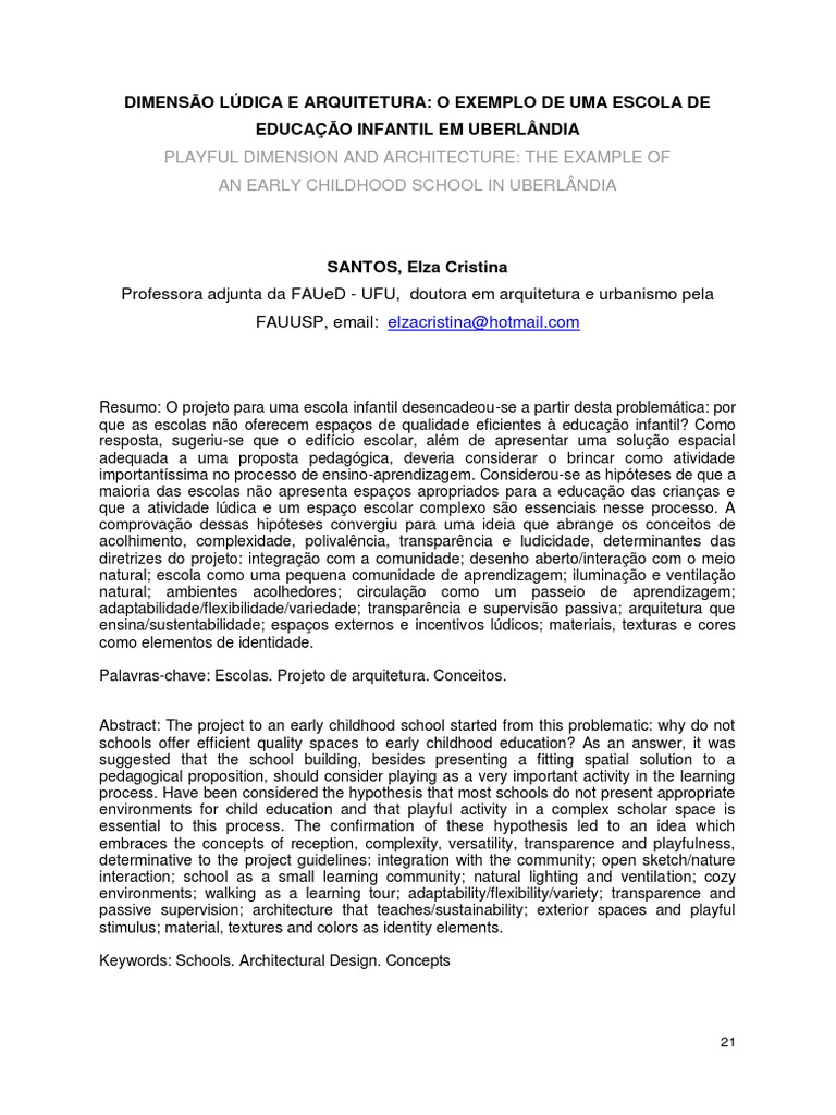 por objetivo. cuja investigação teve como ponto de partida o interesse em estudar aspectos gerais que envolvem o tema arquitetura e educação e.DIMENSÃO LÚDICA E ARQUITETURA: O EXEMPLO DE UMA ESCOLA DE EDUCAÇÃO INFANTIL EM UBERLÂNDIA Este trabalho apresenta o exercício projetual e as reflexões teóricas de uma pesquisa de doutorado na área de projeto de arquitetura. e que os espaços de brincar das cidades estão se tornando espaços do automóvel e da violência. e deveria. contextualizado e delimitado nas escolas que atendem a crianças de zero a seis anos de idade e elaborar um projeto de arquitetura para uma escola de educação infantil. Embora haja muitos estudos sobre a importância da dimensão espacial das atividades relacionadas à educação. portanto. É no espaço escolar que as crianças poderão recuperar os espaços de brincar perdidos nas cidades. 22 . mesmo quando se percebe que existe uma relação de afinidade entre o projeto pedagógico adotado e o edifício escolar? Como resposta para esse questionamento. lúdica e ambiental necessárias à aprendizagem e ao desenvolvimento infantil. colocou-se em questão uma problemática envolvendo especialmente as escolas públicas de educação infantil: por que essas escolas não oferecem espaços de qualidade eficientes e adequados à educação infantil. apresentar soluções que contemplassem essa necessidade. o espaço escolar torna-se ainda mais relevante. muito além de apresentar uma resposta espacial adequada para a realização e aplicação de um determinado projeto pedagógico. que apresente soluções com qualidade espacial. que também se apresenta como um problema arquitetônico. este assunto ainda não foi esgotado. que para brincar é necessário espaço. compreender o espaço escolar. já que é nas escolas que as crianças passam a maior parte do seu tempo. sendo assim. sugeriu-se que o edifício escolar. deveria considerar também o brincar como uma atividade importantíssima no processo de aprendizagem infantil. Delineado o problema e considerando o senso comum de que a criança aprende brincando.