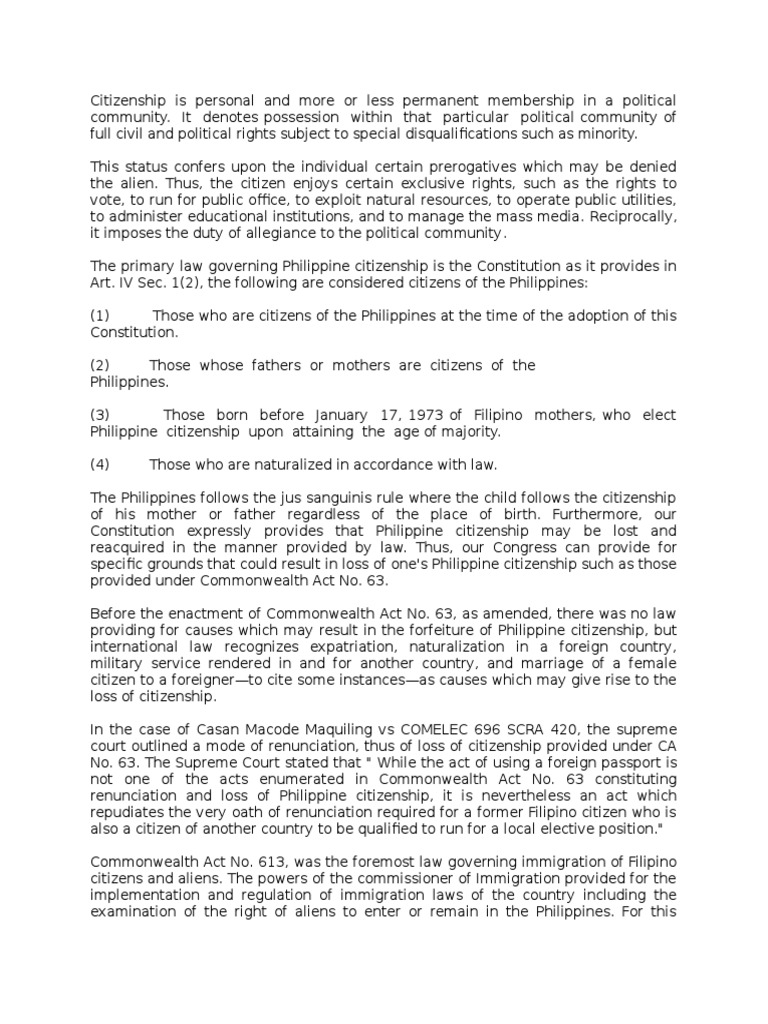 Citizenship is personal and more or less permanent membership in a political