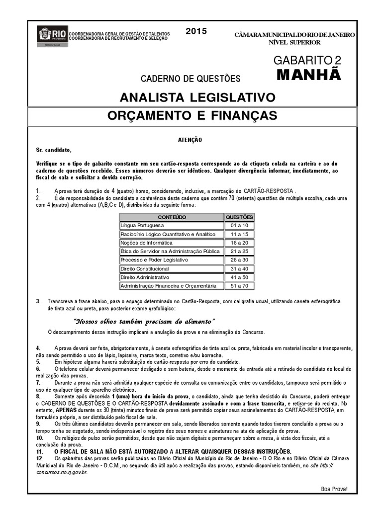 Os gabaritos das provas sero publicados no Dirio Oficial do Municpio do Rio de Janeiro - D.O Rio e no Dirio Oficial da Cmara