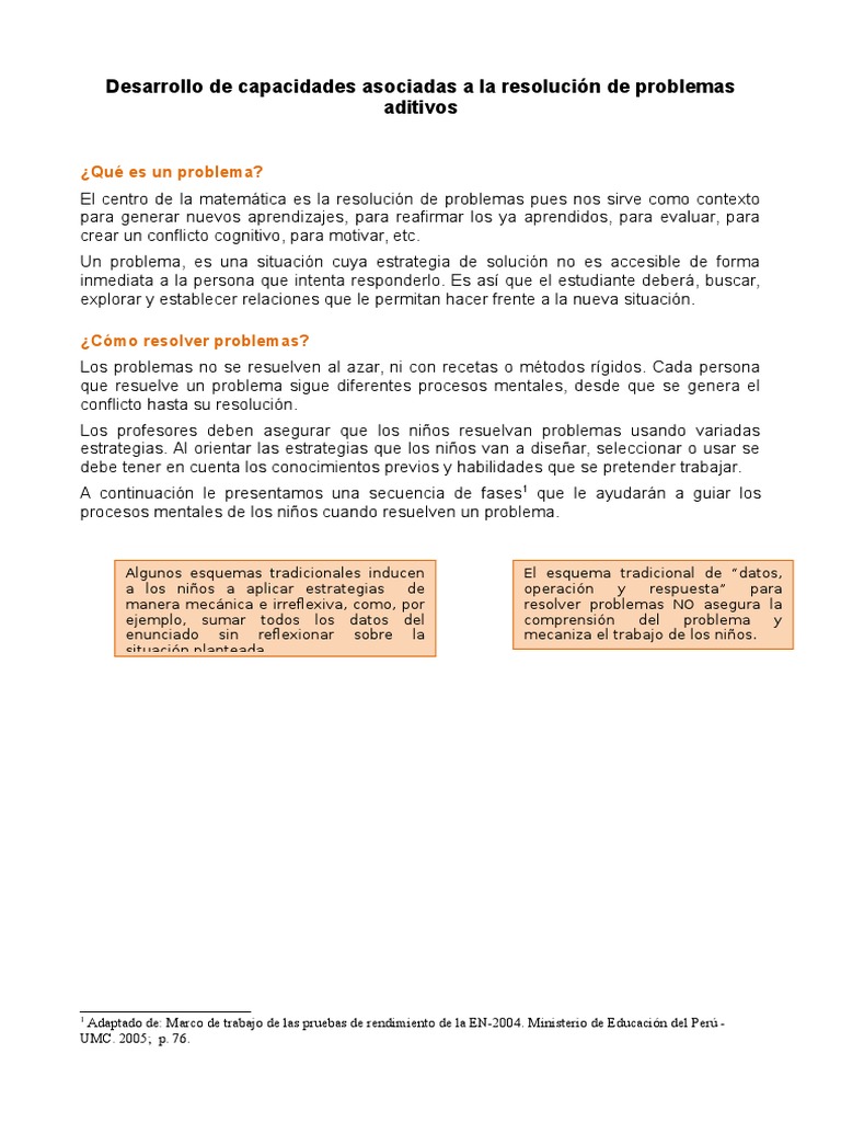 por ejemplo si se juntando separando dos cantidades y luego comparando.COMPRENDER EL PROBLEMA: Lo primero que debe asegurar es que el niño entienda bien de qué trata el problema. Reconozca qué es lo que se pide encontrar Reconozca qué información necesita para resolverlo y si hay información suficiente Reconozca con qué información cuenta y qué información no es necesaria Comprenda qué relación hay entre los datos y la pregunta Muestre interés en el problema Adicionalmente para el caso de los problemas aditivos. DISEÑAR O ADAPTAR UNA ESTRATEGIA DE SOLUCIÓN: Antes de que el niño haga cálculos debe pensar de qué maneras puede resolver el problema. En esta primera fase usted debe asegurarse de que el niño: Lea el problema detenidamente Exprese el problema con sus propias palabras Lo exprese sin mencionar las cantidades Identifique todos los datos Identifique si necesita obtener más información de un diagrama. Identifique si se están realizando igualaciones de grupos o datos y cuál es el más grande o largo. cuáles son las partes y cuál es el todo Identifique si hay grupos que se juntan o separan. Identifique si se están realizando varias de las acciones anteriores en un mismo problema. si las hubiera. debe asegurarse de que el niño: Identifique si hay grupos que forman la parte de un todo. Para iniciar esta segunda fase es necesario que asegure que el niño: Reconozca si es necesario emplear todos los datos Ensaye algunas tablas o gráficos o un diagrama para visualizar la situación Intente simular la situación Use una representación adecuada de la situación (en caso se haya representado) Estima cuál podría ser la respuesta . tabla o dibujo Identifique las condiciones del problema. etc. qué cosas se juntan o cuáles se separan Identifique si se están realizando comparaciones de grupos o datos y cuál es el más grande o largo.