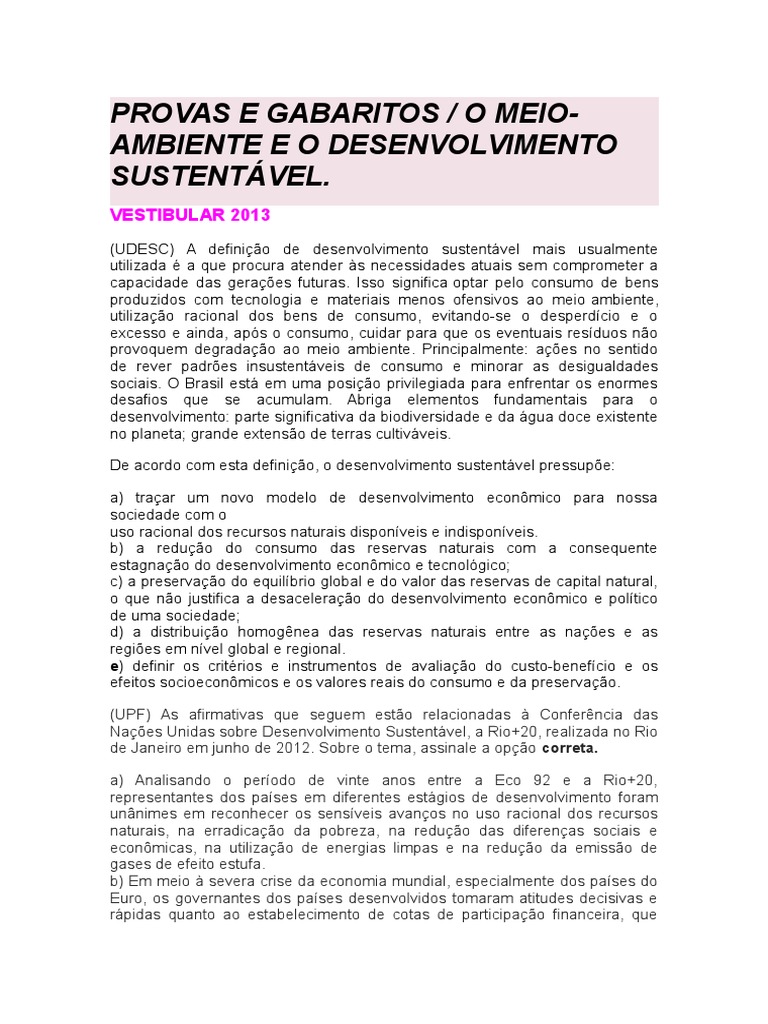 PROVAS E GABARITOS / O MEIOAMBIENTE E O DESENVOLVIMENTO
