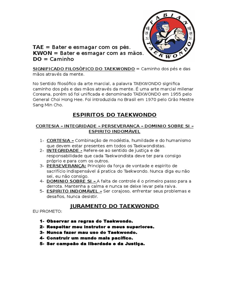 No Sentido filosfico da arte marcial, a palavra TAEKWONDO significa