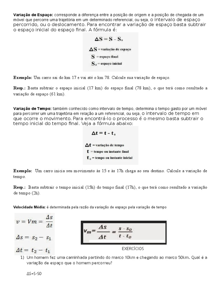 Exemplo: Um carro sai do km 17 e vai at o km 78. Calcule sua variao de espao.