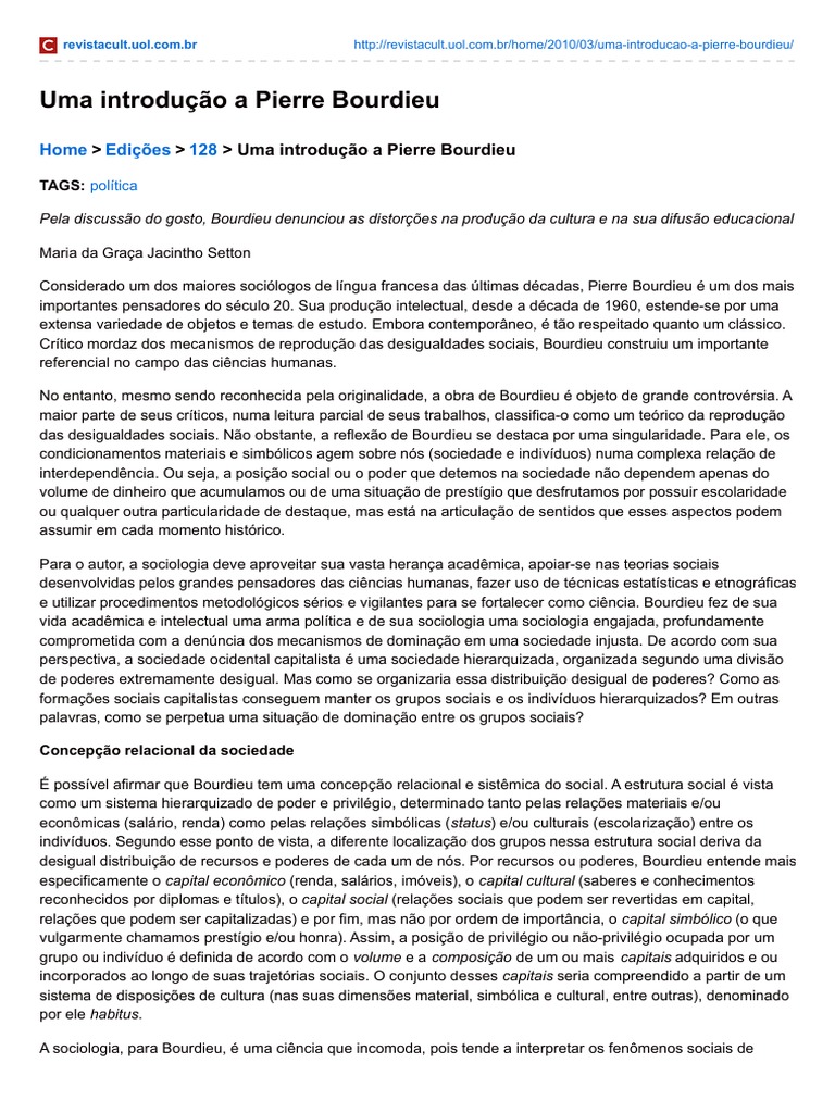 Considerado um dos maiores sociólogos de língua francesa das últimas décadas, Pierre Bourdieu é um dos mais importantes pensadores do século 20. Sua produção intelectual, desde a década de 1960, estende-se por uma extensa variedade de objetos e temas de estudo. Embora contemporâneo, é tão respeitado quanto um clássico. Crítico mordaz dos mecanismos de reprodução das desigualdades sociais, Bourdieu construiu um importante referencial no campo das ciências humanas.