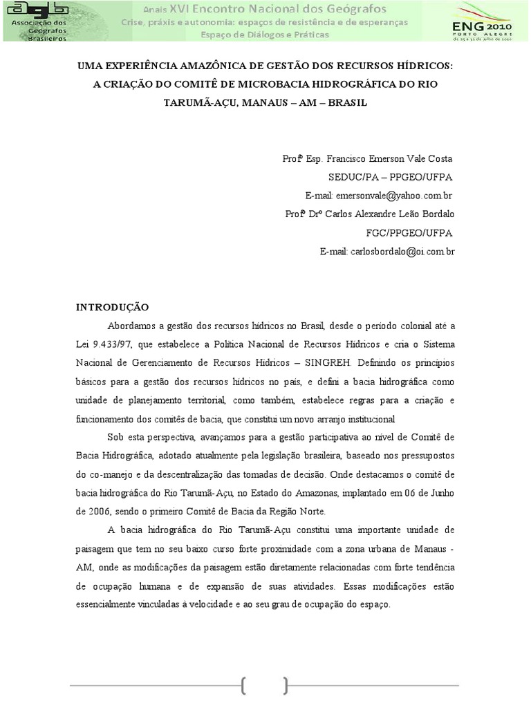 UMA EXPERINCIA AMAZNICA DE GESTO DOS RECURSOS HDRICOS: