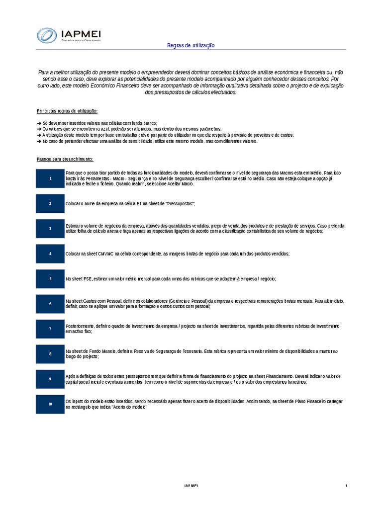 Para a melhor utilizao do presente modelo o empreendedor dever dominar conceitos bsicos de anlise econmica e financeira ou, no