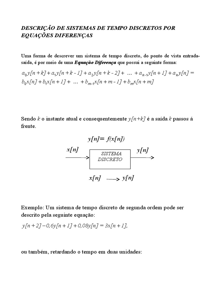 Uma forma de descrever um sistema de tempo discreto, do ponto de vista entradasada, por meio de uma Equao Diferena que possui a seguinte forma: