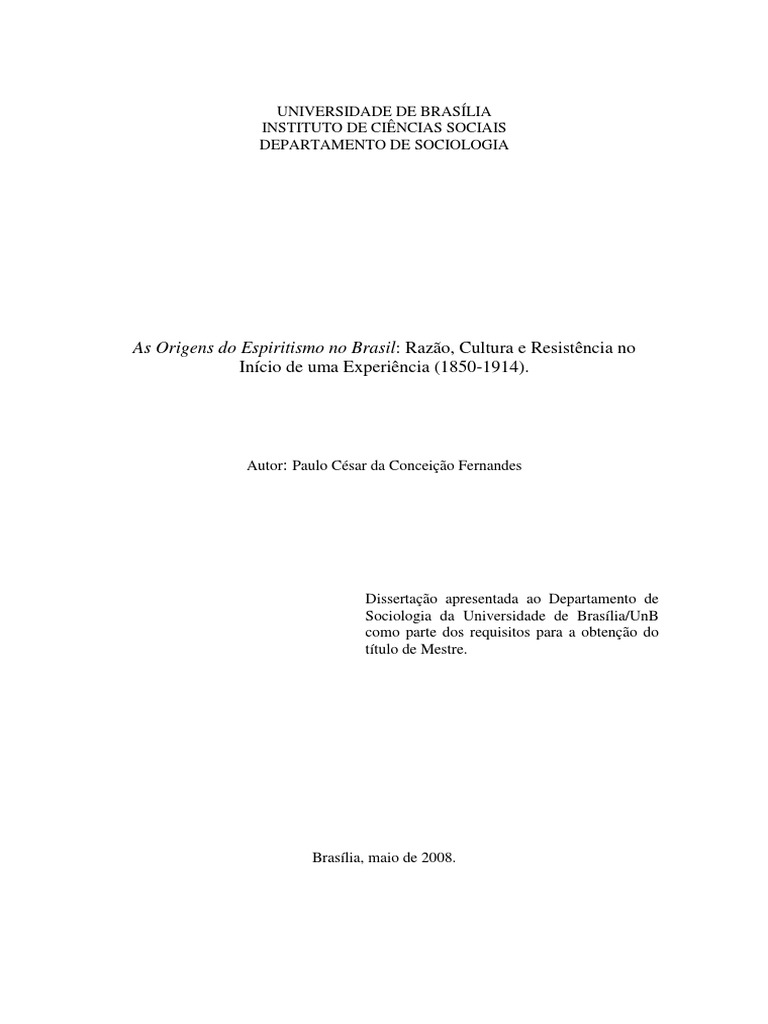 Keywords: Sociology. a process started in the XIX century but still present nowadays. We also search for comprehension of spiritism qua talis.The Origins of Spiritism in Brazil: dialogue. our (religious) culture? In conclusion we can say that both Brazil and Spiritism influenced each other. The objective of this research is to understand the relations between this doctrine and Brazil. History. Spiritism arrived here in Brazil and experienced a fast propagation. who is responsible for its divulgation and also the author of some books about the subject. Spiritism in Brazil. . 2008. its basis. or did it have any contribution for. a synthesis imposed itself. reason and resistance in the beginning of an experience (1850-1914)1. Spiritism. Cultural Sociology. Sometimes these mutual exchanges did not come in pacific ways and each side searched to show its “resistances” inside the “dialogue” established. and the result that took place was a spiritism more Brazilian and a Brazil which learned to accept Spiritism. and to answer some questions that serve as guidelines for this work. It has as key principles the immortality of the soul. Its first appearance came via the work of “Allan Kardec”. Supervisor: Prof. After having a history of problems in Europe (because of some of its controversial concepts). 1 Dissertation for a Master Degree on Sociology presented on June 19. a pseudonym of the pedagogue from Lyon. such as: What is spiritism. relations which are expressed in socio-cultural characteristics that arose as a result of the contact of these two realities. Hippolyte-Léon Denizard Rivail. Eurico Antônio Gonzalez Cursino dos Santos. and what is its history? Why did it come to Brazil and who welcomed it here? What sort of changes did spiritism face when it came to our country and what did it contribute to. 2 Bachelor and Master in Sociology by the University of Brasília (UnB). Paulo César da Conceição Fernandes2 Abstract Spiritism is a doctrine born in France during the XIX century. the possibility of communication with the “dead” and reincarnation. However. history and most important fundaments. Sociology of Religion. Sociology of Knowledge.