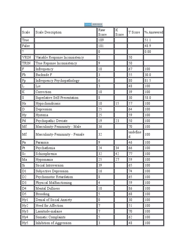 Obvious 10 60 100 Pd-S Psychopathic Deviate.0 O-H Overcontrolled Hostility 10 41 71.0 WRK Work Interference 10 56 51.5 R Repression 10 39 81. Subtle 7 36 100 Hy-O Hysteria.5 Family Problems 3 44 52.5 d AAS Addiction Acknowledgement 3 51 38.1 A Anxiety 16 58 61.4 Do Dominance 10 30 76.9 . Subtle 4 35 100 Ma-O Hypomania.1 Es Ego Strength 27 undefine 76.3 Ho Hostility 22 54 68. Obvious 13 73 100 Hy-S Hysteria.6 d GF Feminine Gender Role 19 32 65.3 d Mt College Maladjustment 22 67 GM Masculine Gender Role 16 undefine 59. Subtle 12 41 100 Pd-O Psychopathic Deviate. Subtle 9 45 100 Pa-O Paranoia.5 APS Addiction Potential 22 46 74.5 TRT Negative Treatment Indicators 2 43 23.2 PK Post-traumatic Stress Disorder 20 70 100 PS Post-traumatic Stress Disorder 19 61 75.4 MDS Marital Distress 5 60 64. Subtle 14 65 100 82. Obvious 5 61 100 Pa-S Paranoia. Obvoius 11 64 100 Ma-S Hypomania.9 d MAC-R MacAndrew Alcoholism Scale-Revised 11 undefine 73.Scale Scale Description Raw Score SOD Social Discomfort FAM K Score T Score % Answered 13 60 87.0 D-O Depression. Obvious 17 72 100 D-S Depression.0 Re Social Responsibility 9 undefine 63.
