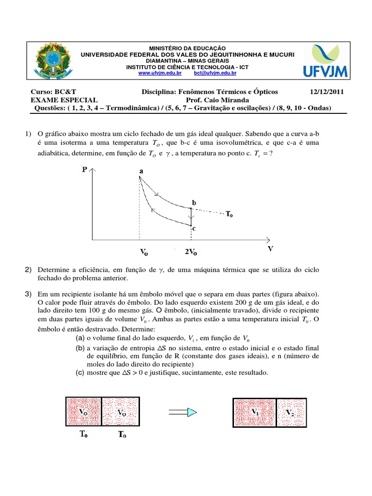 Questes: ( 1, 2, 3, 4 Termodinmica) / (5, 6, 7 Gravitao e oscilaes) / (8, 9, 10 - Ondas)
