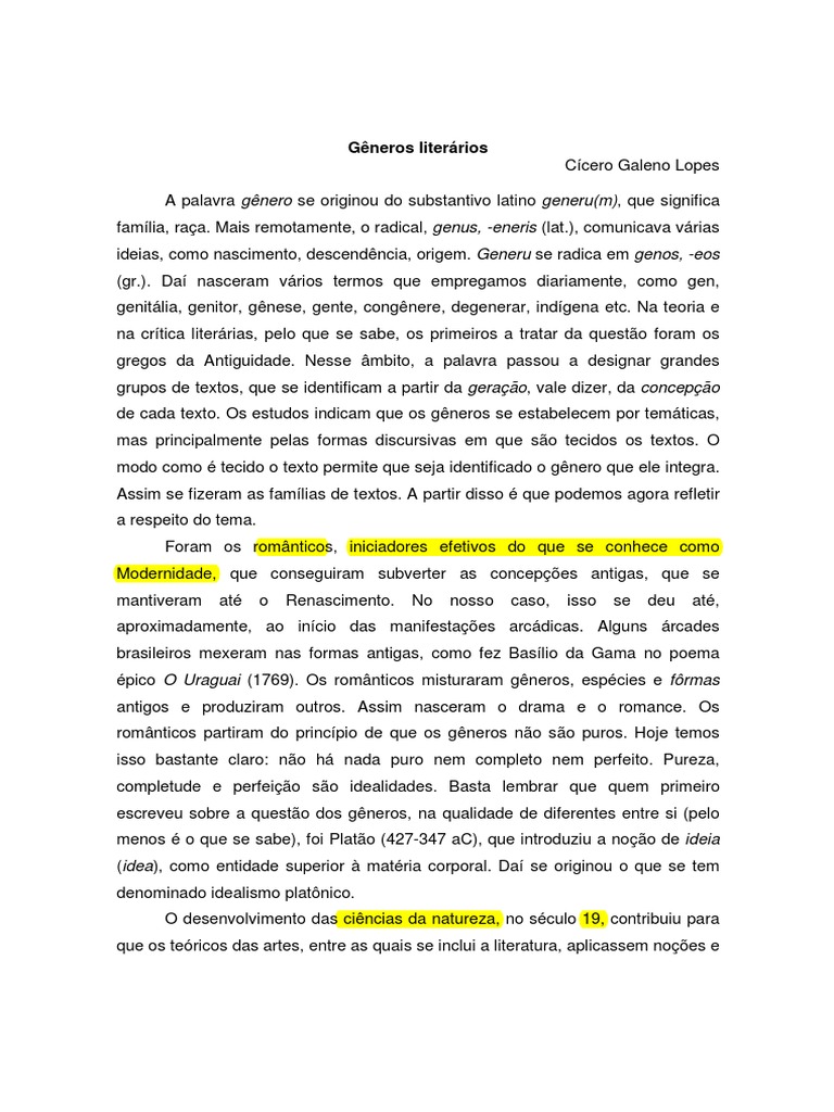 Assim se fizeram as famílias de textos. A partir disso é que podemos agora refletir a respeito do tema. Foram os românticos, iniciadores efetivos do que se conhece como Modernidade, que conseguiram subverter as concepções antigas, que se mantiveram até o Renascimento. No nosso caso, isso se deu até, aproximadamente, ao início das manifestações arcádicas. Alguns árcades brasileiros mexeram nas formas antigas, como fez Basílio da Gama no poema épico O Uraguai (1769). Os românticos misturaram gêneros, espécies e fôrmas antigos e produziram outros. Assim nasceram o drama e o romance. Os românticos partiram do princípio de que os gêneros não são puros. Hoje temos isso bastante claro: não há nada puro nem completo nem perfeito. Pureza, completude e perfeição são idealidades. Basta lembrar que quem primeiro escreveu sobre a questão dos gêneros, na qualidade de diferentes entre si (pelo menos é o que se sabe), foi Platão (427-347 aC), que introduziu a noção de ideia (idea), como entidade superior à matéria corporal. Daí se originou o que se tem denominado idealismo platônico.