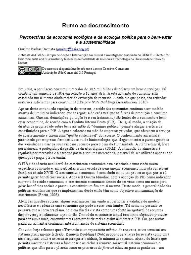economia ecológica, partiu à defesa do decrescimento sustentável.