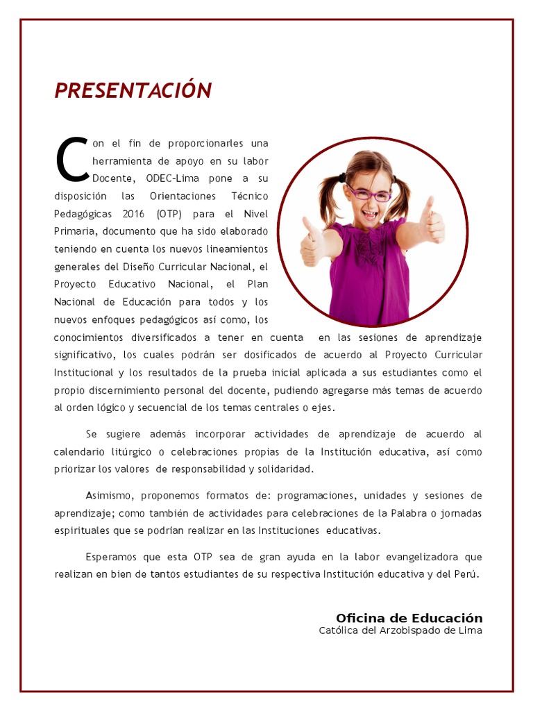 primaria y si es posible con el del nivel secundaria. Velar por la ejecución del Plan de Apostolado. Ser el nexo entre ODEC-Lima y su Institución educativa para motivar y promover la labor pastoral. A Nivel Apostólico Debe dialogar con el Párroco que corresponde a su jurisdicción y presentarle el Plan de Apostolado con las actividades Religiosas que realizará para pedirle su apoyo en estas actividades y en la pastoral.Formar el Equipo de Apostolado con un docente de cada ciclo del nivel inicial. A Nivel Técnico Pedagógico Debe velar porque cada docente de primaria respete y cumpla las horas completas del área de Educación Religiosa. de acuerdo a los temas que están sugeridos en la Programación del Área de Educación Religiosa de su jurisdicción y use textos con autorización eclesiástica. (Ver formato en las páginas siguientes) 67 Arzobispado de Lima Oficina de Educación . Promover el apoyo y la participación activa de todo el personal de la Institución educativa en las Actividades Apostólicas. para que le apoyen en la elaboración y realización del Plan de Apostolado de su Institución educativa. Mantenerse informado(s) de la labor pastoral a nivel primaria. Compartir lo recibido con los (las) docentes de su Institución educativa para un mejor trabajo comunitario y en la medida de lo posible hacer una réplica del taller o la formación recibida previo diálogo y acuerdo con su Director(a). Motive para que cada docente se actualice a través de las Jornadas de Capacitación y de los Cursos de Formación que brinda la Oficina de Educación Católica (ODEC-LIMA) u otras instituciones autorizadas. Participar en las actividades pastorales y de formación que ODEC-Lima le ofrece para su crecimiento como Delegado de Apostolado del Nivel Primaria. etc.