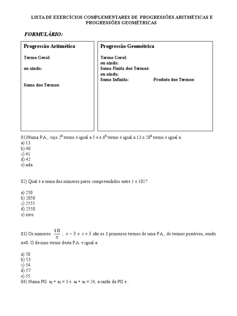 LISTA DE EXERCCIOS COMPLEMENTARES DE PROGRESSES ARITMTICAS E
