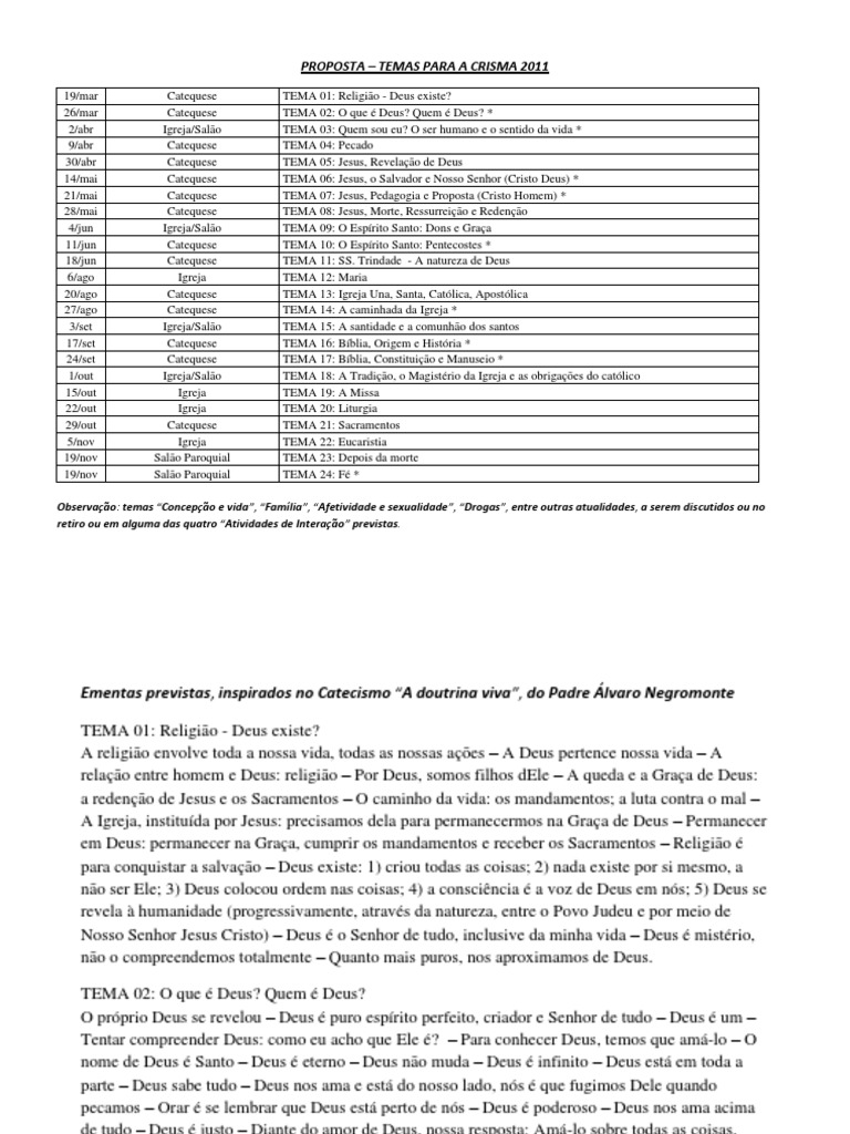 nós é que fugimos Dele quando pecamos – Orar é se lembrar que Deus está perto de nós – Deus é poderoso – Deus nos ama acima de tudo – Deus é justo – Diante do amor de Deus.Ementas previstas. nossa resposta: Amá-lo sobre todas as coisas. entre o Povo Judeu e por meio de Nosso Senhor Jesus Cristo) – Deus é o Senhor de tudo. criador e Senhor de tudo – Deus é um – Tentar compreender Deus: como eu acho que Ele é? – Para conhecer Deus. não o compreendemos totalmente – Quanto mais puros. instituída por Jesus: precisamos dela para permanecermos na Graça de Deus – Permanecer em Deus: permanecer na Graça. cumprir os mandamentos e receber os Sacramentos – Religião é para conquistar a salvação – Deus existe: 1) criou todas as coisas. . 3) Deus colocou ordem nas coisas. amar. perdoar e fazer o bem. nos aproximamos de Deus. TEMA 02: O que é Deus? Quem é Deus? O próprio Deus se revelou – Deus é puro espírito perfeito. inclusive da minha vida – Deus é mistério. através da natureza. inspirados no Catecismo “A doutrina viva”. 2) nada existe por si mesmo. a não ser Ele. temos que amá-lo – O nome de Deus é Santo – Deus é eterno – Deus não muda – Deus é infinito – Deus está em toda a parte – Deus sabe tudo – Deus nos ama e está do nosso lado. confiar Nele e temê-lo. do Padre Álvaro Negromonte TEMA 01: Religião . amar ao próximo. Revelação de Deus A promessa de Deus: vencer o pecado e a morte – Deus não abandonou a humanidade – Deus quis se revelar ao homem: não podemos conhecê-lo sozinhos – A pedagogia de Deus: Ele se revela à humanidade por etapas – A criação – O povo de Israel – Jesus Cristo: a revelação definitiva – Deus disse tudo em Jesus – Não haverá outra revelação – A revelação chega até nós através da Igreja. o Salvador e Nosso Senhor (Cristo Deus) O mistério da Encarnação – Jesus é Deus e homem – Jesus é uma só pessoa – Jesus é nosso centro – Jesus é Deus conosco – A missão de Jesus: salvar a humanidade do pecado – Jesus fez milagres – A doutrina de Jesus vem de Deus – Jesus ressuscitou – Jesus é o Senhor: devemos adorá-lo – Participar da natureza divina de Jesus: seguir o que Jesus ensinou. TEMA 03: Quem sou eu? O ser humano e o sentido da vida Somos corpo e alma – Deus deu ao homem sensibilidade. somos filhos dEle – A queda e a Graça de Deus: a redenção de Jesus e os Sacramentos – O caminho da vida: os mandamentos. TEMA 05: Jesus. inteligência e vontade – O ser humano participa da natureza divina: somos filhos adotivos de Deus –Preciso construir um sentido para minha vida – Liberdade é fazer escolhas – O sentido da vida: trabalhar. e aceitar o sofrimento inevitável – Ter esperança: somos imortais e nosso destino é o céu. 4) a consciência é a voz de Deus em nós.Deus existe? A religião envolve toda a nossa vida. a luta contra o mal – A Igreja. 5) Deus se revela à humanidade (progressivamente. TEMA 06: Jesus. mas carente da Graça Dele – Os Dez Mandamentos – Pecado mortal – Pecado não é o que eu acho – Escolher entre o bem e o mal – Importância da oração – Deus quer perdoar o homem e salvá-lo: promessa de salvação. TEMA 04: Pecado O que nos afasta de Deus – O mal e a mentira: presentes no mundo hoje – O pecado original e suas conseqüências: nossa condição humana limitada e imperfeita – Seguir a Jesus é se esforçar para superar suas limitações – Sou criatura amada por Deus. todas as nossas ações – A Deus pertence nossa vida – A relação entre homem e Deus: religião – Por Deus.