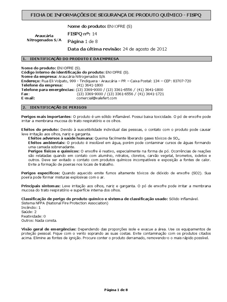FISPQ nº: 14 Página 1 de 8 Data da última revisão: 24 de agosto de 2012