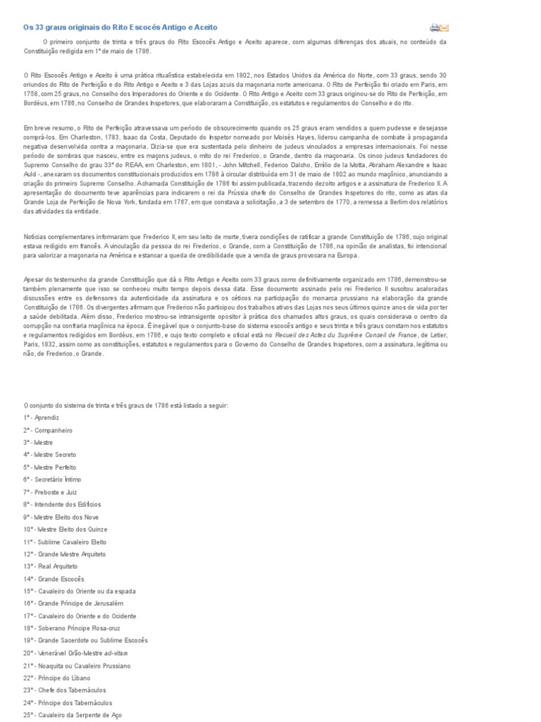 O primeiro conjunto de trinta e trs graus do Rito Escocs Antigo e Aceito aparece, com algumas diferenas dos atuais, no contedo da