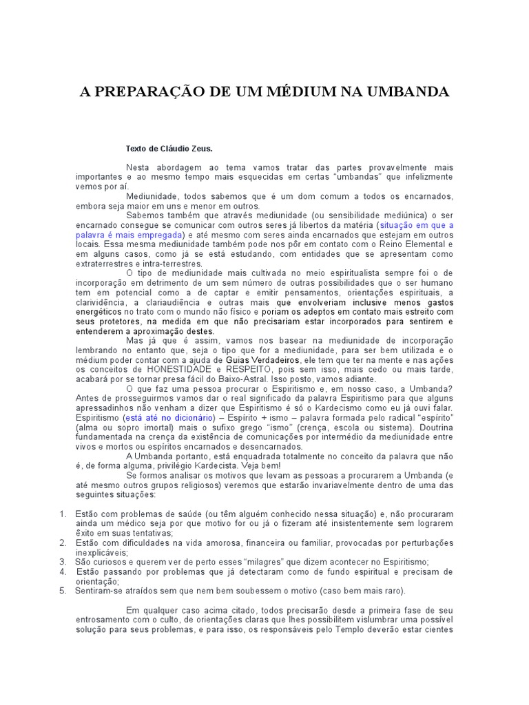 só quer que as pessoas se compreendam e se amem. desde que devidamente orientados. palavras e atitudes. consigo mesmo e principalmente com aqueles que vêm em busca de auxílio. coragem e FÉ deverão ser as companheiras inseparáveis que os tornarão aptos a aprenderem com os que estiverem acima e ensinarem aos que estiverem abaixo. ou apenas para se livrarem de males que as acompanham ou para conseguirem através delas e de supostos santos ou seja que nome se lhes queiram dar. despreparadas. ainda que o Chefe do grupo "tenha grandes poderes mediúnicos".e oferendas que o homem se verá livre das mazelas que quase sempre atrai por seus próprios pensamentos. esquecendo-se que por trás e acima de tudo isso estão entidades que não são meros bonecos que aceitem todas essas demonstrações como atitude de seres que queiram realmente evoluir. Não entenderam ainda que para que haja religação (religião) é preciso que o ser humano saia dessa farsa em que se encontra e pare de achar que os seres espirituais superiores têm que aceitá-los como eles são e que "as portas do céu estão abertas" para todas essas ignomínias que cometem" em nome das religiões". poderão ser amanhã os que levarão esses conhecimentos a outros. e até mesmo em cargos políticos conseguidos pelos votos de pessoas que acham que. no sentido de nos libertarmos aos poucos. se cada um der o melhor de si. seus colares. Todos nós sabemos que as armadilhas do Baixo Astral existem. que pelo menos ao que se sabe. dando continuidade e até melhorando as formas de propagação de nossas doutrinas e cultos. Cada Dirigente de grupo ou Terreiro deve ter em mente que cada Ser que chega para ser orientado é como ele próprio – um Ser da Criação – e como tal. sinceridade. pessoas que por qualquer motivo possam ser presas . Pode haver maior contradição do que essa? Nos preocupamos com esses aspectos da religião porque é preciso que todos os que nela se iniciam estejam cientes das responsabilidades que assumem consigo e com entidades mais e menos evoluídas que por certo se apresentarão para acompanhá-los pelos novos caminhos. que a verdadeira Umbanda (e acredito que todas as outras) foi criada na Terra para tentar elevar a consciência dos seres encarnados para mundos além desse material a que estamos presos temporariamente. entendam que o grupo a que pertencem é tão poderoso quanto o indivíduo mais fraco que ali esteja (em outras palavras e como costumamos ouvir: "a corrente é tão forte quanto o mais fraco de seus elos"). cientes devem estar de que. É também muito importante que esses médiuns. Entenda irmão. muitos são os que se achegam para se exibirem com seus "guias". Cada Dirigente de Terreiro tem o dever de orientar seus dirigidos fazendo-os compreender suas responsabilidades e deveres para com o grupo. Babalorixá ou outro qualquer nome que queira ter em cargo de chefia. recebam ensinamentos que sejam importantes para aperfeiçoarem seus dons mediúnicos de tal forma que possam ter acesso positivo às entidades dos diversos Planos Evolutivos e. o que leva até mesmo ao fato de existirem desavenças e guerras onde irmãos chegam a matar outros em nome de um "DEUS". Porque as pessoas procuram as religiões ainda nos dias de hoje. principalmente. cada um é responsável pelas ações comportamentais que os levarão às vitórias reais ou a pseudo-vitórias temporárias com conseqüências às vezes funestas. de uma vez por todas. e desse modo. os bens materiais. Todos nós sabemos que os que hoje vêm em busca de orientação. auferidas por interesses não raramente mesquinhos. através dos ensinamentos de Jesus. honestidade. preste atenção: Mais do que nunca é importante que as pessoas sejam corretamente orientadas nos cultos que envolverem práticas com o "Mundo Invisível". se houver no grupo pessoas medrosas. e dessa forma. Umbandomblé e principalmente Candomblé. sejam levados a compreender que uma vez iniciado seu caminho dentro da Umbanda ou qualquer outra religião. que não são meras lendas e que elas acontecem até com o nome de Jesus diretamente envolvido. todos serão beneficiados. Pai No Santo. merece todo o respeito. desde que o seja de fato. do excessivo apego ao que de material existe. enfeites e o pseudo poder de suas entidades. Irmão Dirigente. vacilantes. iniciantes ou não. cuidado e consideração daqueles que se aventuram a serem Líderes. Por que nos preocupamos tanto com esses aspectos da religião? Porque os erros que vemos hoje são ainda os erros que fazem parte do passado de todas as religiões. as entidades. em se tratando de Umbanda. a notoriedade diante de outros por suas "posições de destaque" nos cultos. é de suprema importância que os médiuns que nos procuram sejam honestamente orientados. bem assim como. os rituais praticados. por conseguirem eleger seus "representantes" estarão mais protegidas ou terão seus desejos satisfeitos e. É muito importante que cada médium do Terreiro compreenda seu valor dentro do ritual e saiba que.