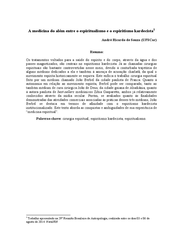 Palavras-chave: cirurgia espiritual; espiritismo kardecista, espiritualismo.