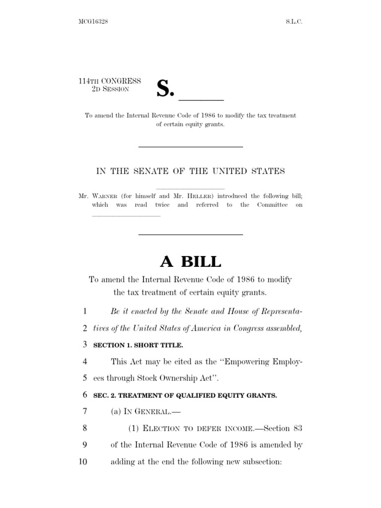 To amend the Internal Revenue Code of 1986 to modify the tax treatment of certain equity grants.