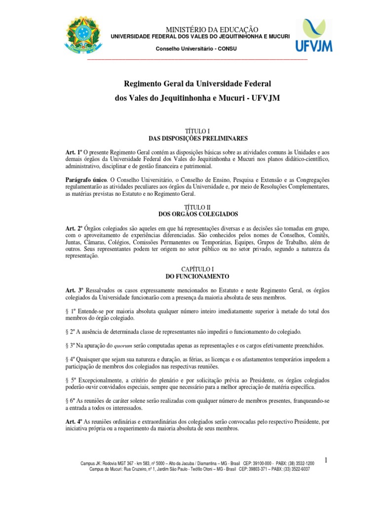 Regimento Geral da Universidade Federal dos Vales do Jequitinhonha e Mucuri - UFVJM