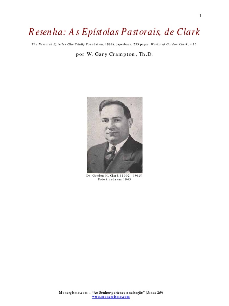 3 Gordon H. Clark, The Pastoral Epistles (The Trinity Foundation, [1983], 1998). A paginao dessa resenha do