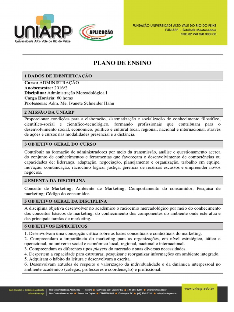 São Paulo: Saraiva.A. art. p.. v. GOSLING. tendências e desafios do profissional. M. A.N.W. V. SOUZA. A... 89-102. G. T. F. V. HAIR Jr. M. P. ARMSTRONG. 2000. Revista Brasileira de Gestão de Negócios. Complementar CHURCHILL.. 80-97. J. A. 27. F.. p. A. Princípios de marketing. Marketing.. 2008. O aluno que não fizer a avaliação correspondente a M1. C. [et al. p. PETER. D. 12.S. P. P. C. 2012. 1998. SANTOS. Administração de marketing: a edição do novo milênio. BRUNETTA. Data: 28/07/2016 . GHOBRIL. S.. In: IX SEMEAD – Seminários em Administração. p. 2. SILVA. 1. Marketing: criando valor para os clientes. 2003.. Os trabalhos feitos durante a aula não poderão ser recuperados.].. 4. LARENTIS.F. B.. KOTLER... LAS CASAS. Princípios de marketing. São Paulo: Atlas.. Comportamento do Consumidor.. ed.. Evolução e Futuro. LAMB Jr. 2014. G. só terá direito à prova substitutiva mediante processo administrativo devidamente protocolado e autorizado pela Secretaria do Aluno e coordenação do curso. Em relação à apresentação dos seminários não há possibilidade de apresentação após a data fixada. 132-149. 2003. MARTINS. F. G.Aos alunos que não entregarem os trabalhos propostos na data especificada (sem justificativa). v. O. Rio de Janeiro: Pearson. serão atribuídas penalidades na nota do trabalho correspondente a 30% da nota adquirida – observando o prazo máximo de entrega em uma semana após a data original de entrega (exceto no final do semestre). 2006. n.R. O Paradigma dos 4Ps do Composto de Marketing – Origem. M. Anais. 10. BROCHADO. 16. 9. n. FEAUSP. São Paulo-SP.. Revista de Gestão. v.J. 2003. 2ªEd.. 2013. 2000. n. LEVY. São Paulo: Saraiva. DIAS. Aspectos metodológicos da segmentação de mercado: base de segmentação e métodos de classificação. São Paulo . São Paulo: Prentice Hall. da satisfação e da lealdade em clientes de um banco de varejo. casos. GREWAL. M. SELEME. 12 BIBLIOGRAFIAS Básica KOTLER. Curitiba-PR: IESDE. F. Rio de Janeiro/RJ: Thompson. exceto se o aluno estiver sob atestado médico – que deverá ser encaminhado via coordenação de curso.. FABRIS.L. R. Mensuração do mix de marketing de serviços. O desenvolvimento do Marketing: uma perspectiva histórica. v.SP. Revista Brasileira de Marketing. aplicações.. Marketing: conceitos. C. LARENTIS. V. Gestão de marketing. Porto Alegre: AMGH. 108-132. SOUZA. 1. exercícios. MINUZZI. LIMA. 2009. n. B. N. A. GONÇALVES. Marketing: definições. 5. P. C. 2012. MCDANIEL. D. Revista de Administração IMED.