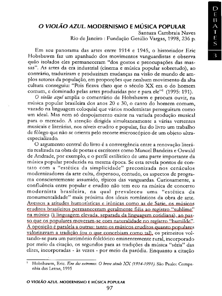 problematizam uma especie de senso comum evolucionista do mundo ocidental, segundo o qual as formas artisticas mais avancadas nascem, forcosamente, nas elites. 0 livro tambem desmonta algumas distincOes fundadas na hieratquizacio de niveis de cultura, ouvindo mUsicos e poetas populares como artistas legitimos, autenomos, vozes indispensiveis na atualizaco das artes no seculo XX.