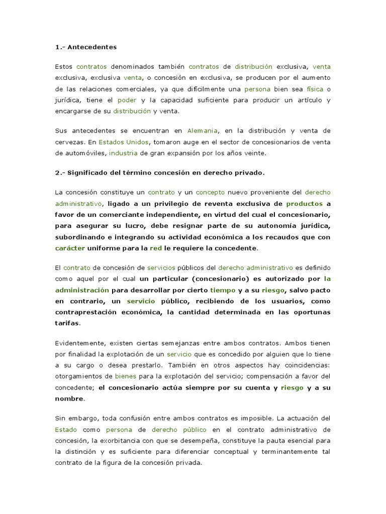 Intuito Personae. que opera salvo oposición manifiesta por alguna de las partes con la anticipación prevista en el contrato.Conmutativo.. Se puede pactar por tiempo indefinido. que se otorgan la una teniendo en vista a la otra. sin embargo.Es un contrato empresarial o también llamado de "colaboración entre empresas". Es posible pero no usual. El concesionario obtiene una ventaja económica consistente en lo que los terceros abonaran por encima del precio que el debe pagar al concedente. corriendo cada cual con los riesgos correspondientes. por ello termina por la ocurrencia de eventos que afecten a la persona de las partes.. Por tanto no cedible ni transferible. 7. titulares de empresas. Hay ventajas reciprocas. o por tiempo determinado. 9. la jurisprudencia francesa ha sostenido firmemente el derecho del concedente de no renovar el contrato. habiendo declarado que la no renovación no constituye un abuso del derecho sino una facultad contractual. el concedente recibe el precio del concesionario y a la vez los beneficios de la de la difusión de sus productos de marca por medio de la red de sus concesionarios 6. Ello independiente de la existencia del riesgo propio de los negocios. ya que ambos son empresarios o comerciantes que realizan un negocio de mutuo beneficio. consistente en que ni concedente ni concesionario saben en definitiva si el negocio en cuestión será beneficioso.Oneroso. un negocio de esta especie con plazo determinado no renovable automáticamente. Ello porque no hay vinculo de subordinación o dependencia entre las partes celebrantes. La concesión se caracteriza por ser un contrato que se celebra entre comerciantes. 8) Duración. con cláusula de renovación automática. Se suele afirmar que la incertidumbre sobre la no renovación de la concesión conspira contra la igualdad de las partes y resiente la autonomía jurídica del concesionario. con cláusula de desahucio dada con cierta anticipación. Se trata siempre de un contrato de tracto sucesivo.Principal.. Pues su vigencia no depende de otros actos o contratos.5... 10. más una fluida demanda de un producto conocido. tales como la quiebra y el convenio que puedan afectarlas 8. .Contrato entre Comerciantes..
