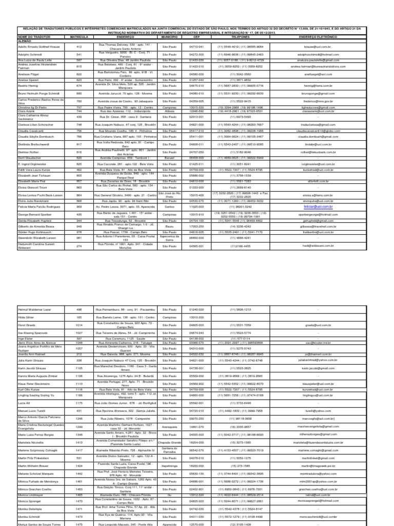 RELAO DE TRADUTORES PBLICOS E INTRPRETES COMERCIAIS MATRICULADOS NA JUNTA COMERCIAL DO ESTADO DE SO PAULO, NOS TERMOS DO ARTIGO 32 DO DECRETO N 13.