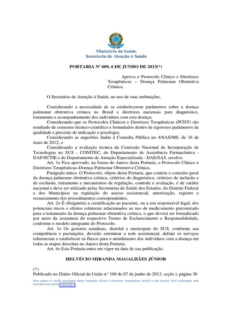 Considerando a necessidade de se estabelecerem parâmetros sobre a doença pulmonar obstrutiva crônica no Brasil e diretrizes nacionais para diagnóstico, tratamento e acompanhamento dos indivíduos com esta doença; Considerando que os Protocolos Clínicos e Diretrizes Terapêuticas (PCDT) são resultado de consenso técnico-científico e formulados dentro de rigorosos parâmetros de qualidade e precisão de indicação e posologia; Considerando as sugestões dadas à Consulta Pública no 4/SAS/MS, de 16 de maio de 2012; e Considerando a avaliação técnica da Comissão Nacional de Incorporação de Tecnologias no SUS - CONITEC, do Departamento de Assistência Farmacêutica - DAF/SCTIE e do Departamento de Atenção Especializada - DAE/SAS, resolve:
