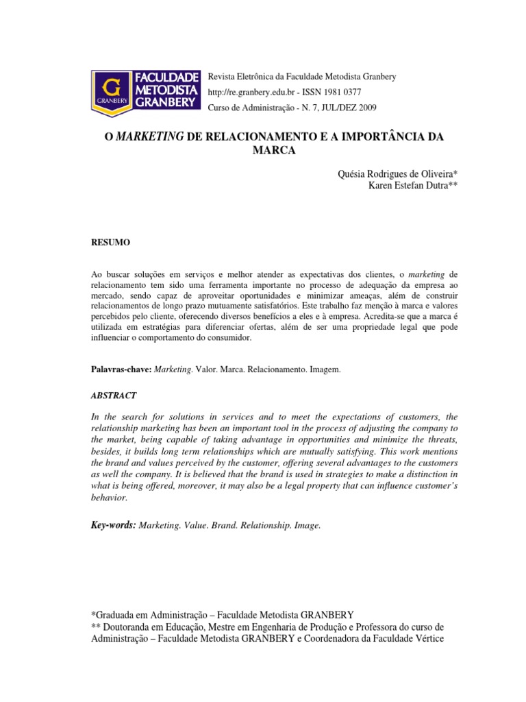Key-words: Marketing. Value. Brand. Relationship. Image.