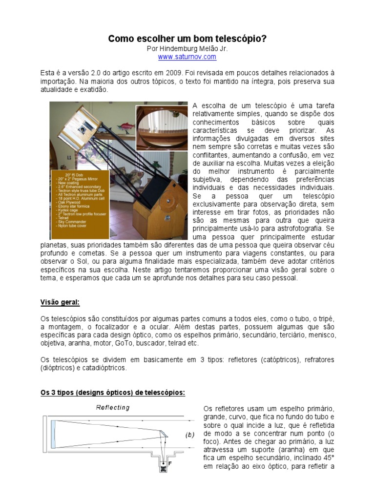 Os telescpios se dividem em basicamente em 3 tipos: refletores (catptricos), refratores