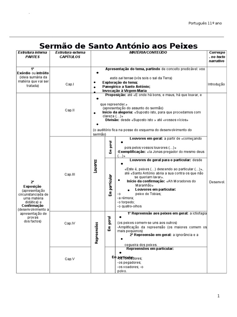 Português 11º ano Paralelismo (entre Sto.91/92 Voadores: são peixes mas querem ser aves. Mudança do Auditório. 4 . Ex(s) Bíblicos – Pedro Deus não quer Roncadores Conselho (conclusão): o melhor é “calar e imitar Santo António” l. António e Padre António Vieira) Santo António: Padre António Vieira: Arimino S. Conclusão: Padre António Vieira conclui que não se conseguindo. através da pregação da doutrina sagrada.23 Pegadores: vivem à custa dos peixes grandes. Capítulo V Repreensões aos peixes em particular: Roncadores: são pequenos e fáceis de pescar. mas muito barulhentos. oportunismo e bajulação Ex(s) Bíblicos – Herodes Santo António também foi pegador. da soberba e da vaidade. Alegoria do parasitismo. Luís de Maranhão Muitos Hereges Colonos corruptos Mudança do púlpito. -Mudança de auditório. Alegoria da arrogância.Mudança de púlpito. pegou-se a Cristo Conselho (conclusão): l. mudar o comportamento do auditório. morrem quando os peixes grandes morrem. deve-se proceder a alterações que consistem em: .