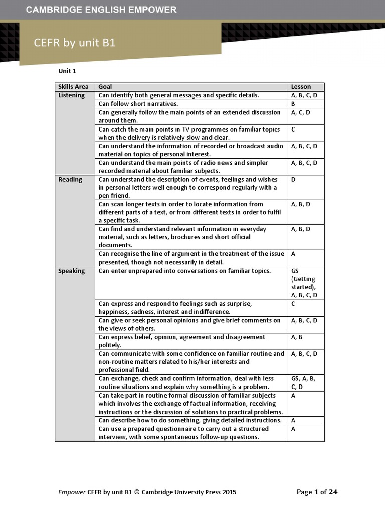 Empower CEFR by unit B1 © Cambridge University Press 2015 D D Page 4 of 24 . discrete simple elements into a connected. linear sequence of points. Can link a series of shorter. describing feelings and reactions in some detail.CEFR by unit B1 Can write accounts of experiences.