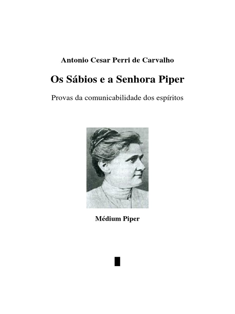 evoca a existência normal que ela leva junto com suas duas devotadas filhas. Piper contou com o prefácio de Sir Oliver Lodge. O trabalho de William James é o relato racional. milhares e milhares de consulentes foram levados a idêntica conclusão. convencendo diversos cientistas e inteligências privilegiadas sobre a imortalidade da alma e a comunicabilidade dos espíritos. Alta L. no entanto. inter-relacionando as diversas obras. O livro escrito pela filha é cativante. era o pesquisador remanescente do grupo mais ligado à família. No conjunto. Piper. No início da obra. em suas reuniões e consultas. tão rigorosamente. escrita pela filha Alta Piper. à época da publicação. a obra Expériences d’un Psychiste. bem como por tempo tão longo como tem sido investigada a sra. a estudos científicos – no período de 1885 a 1915 – e ainda em períodos curtos na década de 20. ao mesmo tempo. . onde se sente o amor e a admiração da filha pela mãe devotada e médium dedicada. Alta Piper cita Oliver Lodge: “Não podemos legislar para tais coisas. Mas. destacamos as publicações da Society for Psychical Research. As atividades mediúnicas da sra. Piper serviram para estudos e conclusões científicas importantes. o notável físico inglês considera-a a mais famosa médium de nossos dias. caracterizando uma exemplar vida familiar. de William James. No prefácio. que em 1929. e a obra The Life and Work of Mrs. Piper. temos uma visão mais global sobre a médium. Piper. Reunimos informações diversificadas sobre a médium americana. e exalta o papel de sua mãe: “os anais da pesquisa psíquica não contêm registros de qualquer outro médium que tenha sido tão examinado. a nosso ver.Dessa maneira. nosso negócio é entendê-los”. em caráter missionário. Piper”. Além de afirmar que não há qualquer sorte de dúvida em torno dos dons de Mme. temos de concordar com Michel Sage: “esta mediunidade é certamente a que foi mais estudada por tempo mais longo e por homens de alta competência”. portadora de vários dons e protagonista de feitos mediúnicos notáveis e prestando-se corajosa e. quase que totalmente baseado nos dons da sra.