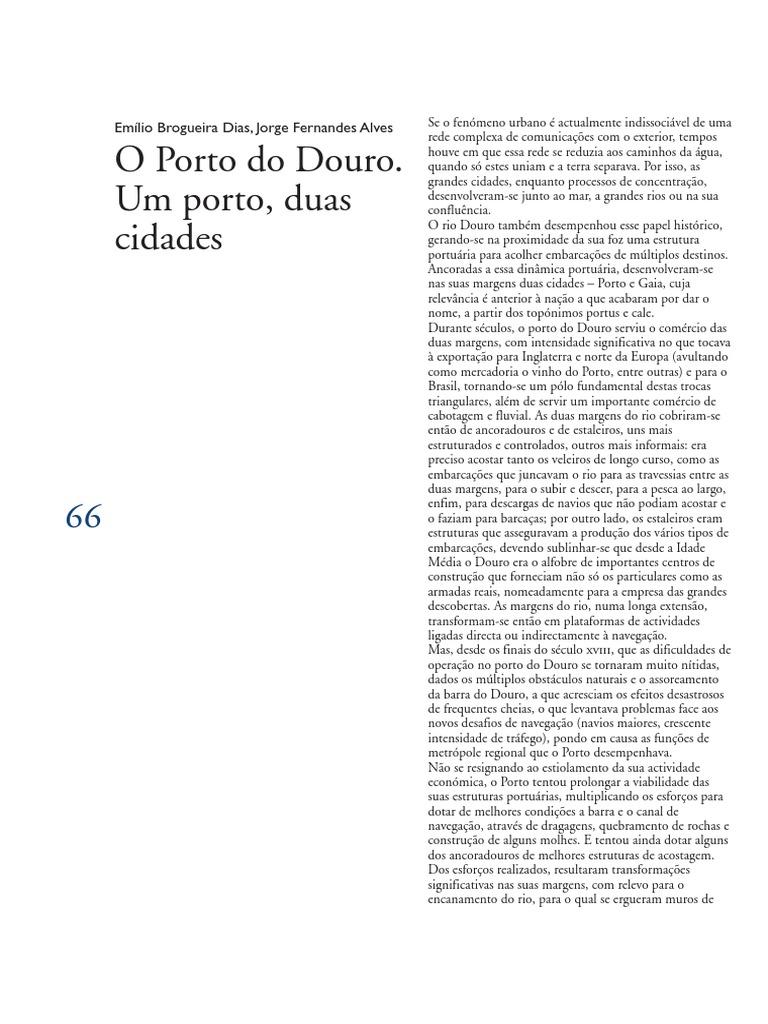 and near its mouth a port structure arose to receive vessels with various destinations. As for the shipyards. the port on the Douro served trade on both banks. which was accomplished with support walls and ramparts over large areas of the right bank. But it was from the end of the th century that the difficulties in the operation of the port on Rio Douro – Cidades do Porto e Gaia Douro River . becoming a fundamental pole for these triangular trades. multiplying its efforts to equip the bar and the navigation channel with better conditions. and the construction of some wharfs. as well as the . some more structured and controlled. as well as for the vessels that were scattered along the river that made the crossings between the two shores. but also the royal fleets.1909 flood the Douro became very accentuated. with a significant amount of the exports going to England and northern Europe (the principal goods being Port wine. then. besides serving the important coastal and river shipping trade. through dredging. Jorge Fernandes Alves Urban life today is inseparable from a complex network of communications with the outside world. large rivers or at their confluence. along which runs the shoreline drive of today. built on the occasion of the International Exposition of . Anchored to this port dynamic. the banks of the river became platforms for activities that were directly or indirectly linked to navigation. One Port. whose importance preceded that of the nation to which they finally gave a name. they were also needed for the unloading of ships that could not tie up and therefore offloaded onto smaller boats. especially the channelling of the river. Not being resigned to see its economic activity waste away. The two banks of the river were dotted with anchorages and shipyards. and it should be pointed out that from Medieval times.The Port of Douro. rock breakwaters. that is to say. This raised problems in facing the new challenges of navigation (larger ships. among others) and to Brazil. Two Cities Emílio Brogueira Dias. but there were times in the past when that network was limited to waterways. For centuries. specially for the undertaking of the great discoveries. they were structures that ensured the production of various types of vessels. The Douro River also had this role in history.cities of Porto and Gaia Rio Douro – cheia de 1909 Douro River . Over a great distance. which eliminated the beach of Miragaia. raising in its place a rampart that made it possible to establish not only the building with the subsequent connections. in a process of concentration the great cities developed next to the sea. when these alone united while land divided. putting in check Porto’s performance of its functions as a regional metropolis. the highway that links Ribeira with the highway that started in Arrábida (from . others being more informal: moorings were needed for sea-going sailing ships. or that sailed up and down the river. begun through the action of the Companhia das Vinhas do Alto-Douro). which was held in the Crystal Palace. Porto tried to prolong the feasibility of its port structures. or fished offshore. the Douro was the hot bed of important centres of construction that not only supplied private citizens. two cities developed on its banks – Porto and Gaia. Two of these projects completely changed the features of the riverside area: One was linked to the construction of the Customs House (/). based on the place names portus and cale. Significant transformations of the banks resulted from these efforts. For this reason. given the multiple natural obstacles and the silting of the bar of the Douro. to which were added the disastrous effects of frequent flooding. increasing intensity of traffic). The city also tried to give some of the anchorages better docking structures.