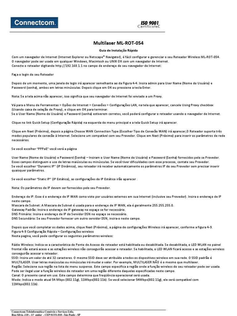 Nota: Os parâmetros de IP devem ser fornecidos pelo seu Provedor.