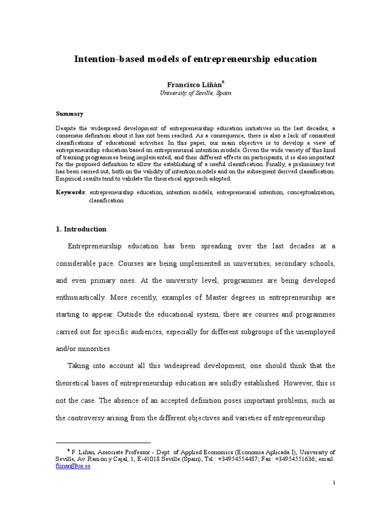 Keywords: entrepreneurship education, intention models, entrepreneurial intention, conceptualization,