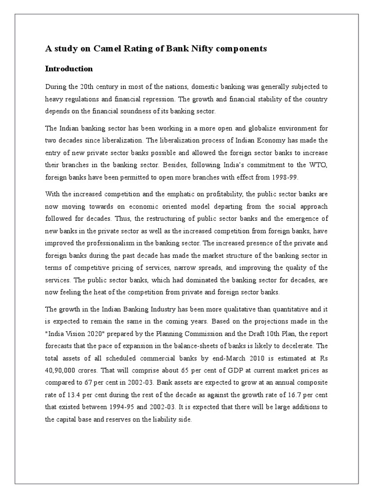Derviz et al. Prasuna (2003) analyzed the performance of Indian banks by adopting the CAMEL Model. the academicians. solvency and efficiency of Japanese Banks using CAMEL rating methodology. He focused explicitly on using a logical model applied to a database of defaulted banks in emerging markets. earnings ability and liquidity position. they evaluated capital adequacy. if a bank has not been examined for more than two quarters.Literature Review In the process of continuous evaluation of the bank’s financial performance of bank nifty components. off-site monitoring systems usually provide a more accurate indication of survivability than its CAMEL rating. Creating a ranking methodology based on camel rating parameters. scholars and administrators have made several studies on the CAMEL model but in different perspectives and in different periods. Statement of the problem Camel rating analysis is conducted on bank nifty components. Said and Saucier (2003) examined the liquidity. (2008) investigated the determinants of the movements in the long term Standard & Poor’s and CAMEL bank ratings in the Czech Republic during the period when the three biggest. Applying camel rating analysis to bank nifty components. innovative products and better bargains. The performance of 65 banks was studied for the period 2003-04. (1995) conducted a study on “A CAMEL Rating's Shelf Life” and their findings suggest that. Higher the camel rating better the profitability and performance of the banks. The author concluded that the competition was tough and consumers benefited from better services quality. . Cole et al. assets and management quality. Godlewski (2003) tested the validity of the CAMEL rating typology for bank's default modelisation in emerging markets. 2. Objectives of the study 1. for a representative sample of Japanese banks for the period 1993-1999.