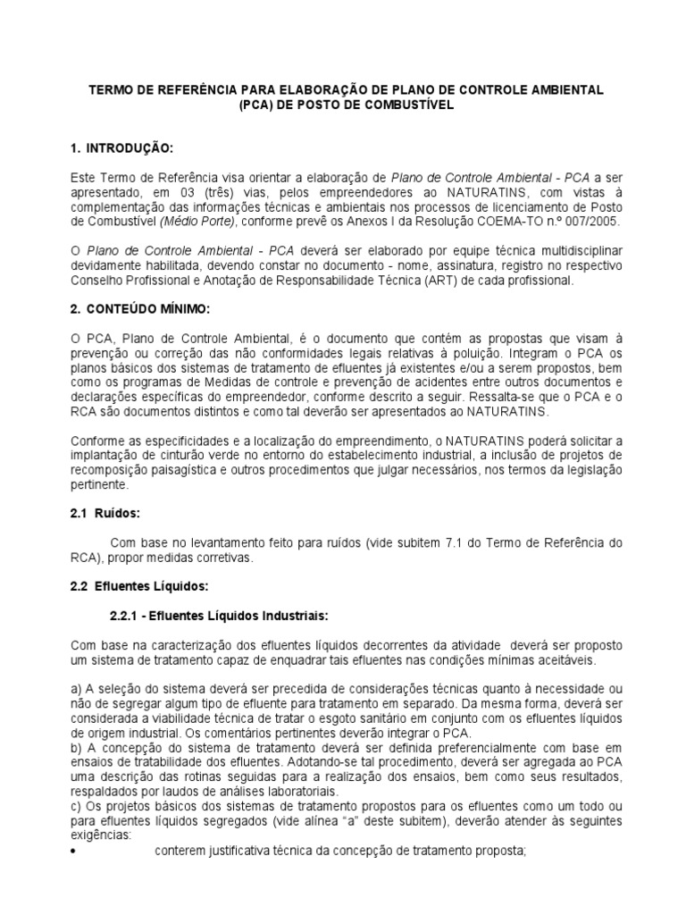 Este Termo de Referncia visa orientar a elaborao de Plano de Controle Ambiental - PCA a ser