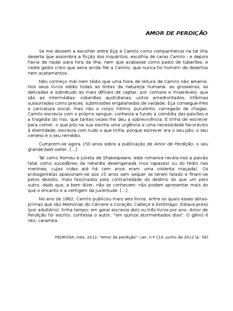 PEDROSA, Ins, 2012. Amor de perdio: Ler, n. 114, junho de 2012 (p. 58)