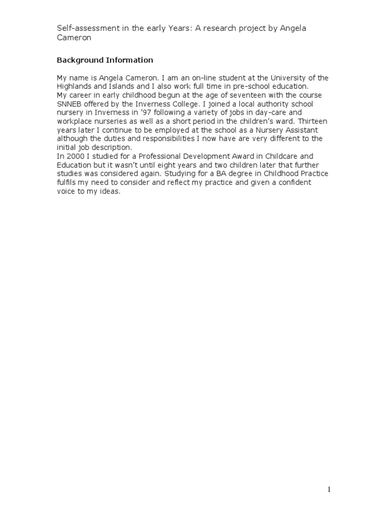 gym. Can self-assessment be a viable and effective tool for learning in pre. Subject: Research Project on Self-Assessment I am currently studying towards a BA in Childhood Practice at the UHI.Self-assessment in the early Years: A research project by Angela Cameron Appendix Appendix 1: Permission letter to parents Dear Parent. If you require any further clarification then please ask. building Written documentation of what children think and say about their learning through familiar. How effective is self-assessment at deepening learning in early years and how do we know? 5. thumbs up/down and traffic lights. 16 . It is not necessary to identify the children at any time. In order to achieve degree status I must pursue and lead a small action research project. In addition we will be using techniques such as happy/sad faces. Be assured that photographs of children are NOT necessary but photos of work such as a junk model may be used. writing. Is self-assessment a feasible tool to use in the routine of the nursery life? It is hoped that this action research project will assist nursery staff to develop their practice in enhancing children‟s involvement with their learning. In order to answer the research questions it is necessary to collect: Examples of children‟s work such as drawings. Does self-assessment happen naturally in free play or formal group times? 3. everyday practices such as circle time. folder reviews with their key worker.The final analysis document will be available to those who wish to see it. Can children have or develop the necessary skills to allow the process? 4. Please indicate below whether you agree or not to allow your child‟s work and words to be used to support the research project. My chosen subject of research is Self Assessment in the Pre-school Years and I wish to answer the following questions: 1.school? 2.
