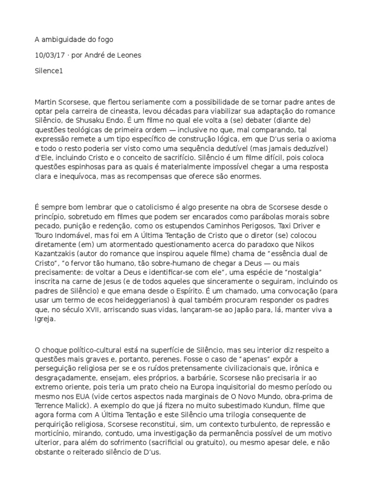 dEle, incluindo Cristo e o conceito de sacrifcio. Silncio um filme difcil, pois coloca